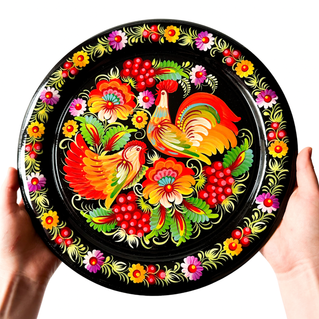 Тарілка декоративна Петриківський розпис ручної роботи з дерева 30 см ПІВНИК і КУРОЧКА Український сувенір